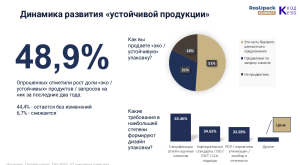 Оценка динамики рассматриваемого рынка разделилась. Почти половина респондентов (49%) указали на увеличение доли устойчивой упаковки и запросов на нее за последние два года. В то же время 44% участников не видят существенных изменений и оценивают спрос как стабильный.