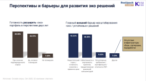Основные препятствия для масштабирования — недостаточный спрос и неготовность клиентов платить больше, высокая себестоимость и длительный срок окупаемости. Ещё 8% указали на отсутствие инфраструктуры для сбора, сортировки и переработки, несмотря на готовность выпускать такую упаковку.
