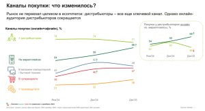 Дистрибьюторы по-прежнему остаются центральным каналом продаж, хотя их доля постепенно снижается: с74% в январе 2024 года до 71% в декабре 2025-го. На маркетплейсах доля покупок выросла с 54% до 66% за тот же период. Покупки в магазинах компьютерной и бытовой техники поднялись с 42% до 52% с января по декабрь 2024 года, но в течение 2025 года опустились до 49%. Продажи офисной бумаги в супермаркетах выросли с 39% до 47%, у производителя — с 31% до 36%.